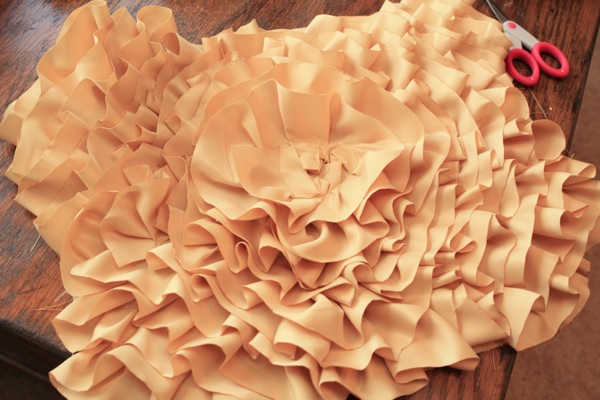 I then pinned a long strip of fabric all around the center of the pillow to fill in the gaps, and continued to layer the ruffles in a circular pattern until I reached the middle of the pillow.